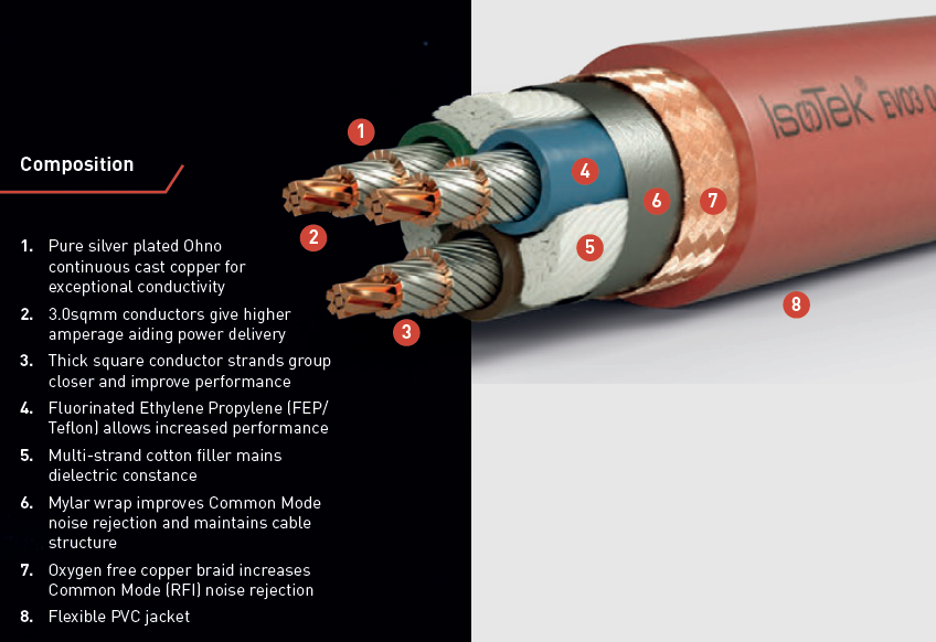 Conductorii din cupru 3.0sqmm placati cu argint Ohno Continuous Cast ofera un nivel de puritate superior comparativ cu OFC traditional. Fiecare conductor dispune de o configuratie in forma de patrat. Geometria si metalurgia utilizata in aceasta constructie ofera performante superbe cu o conductivitate electrica extrem de impresionanta.