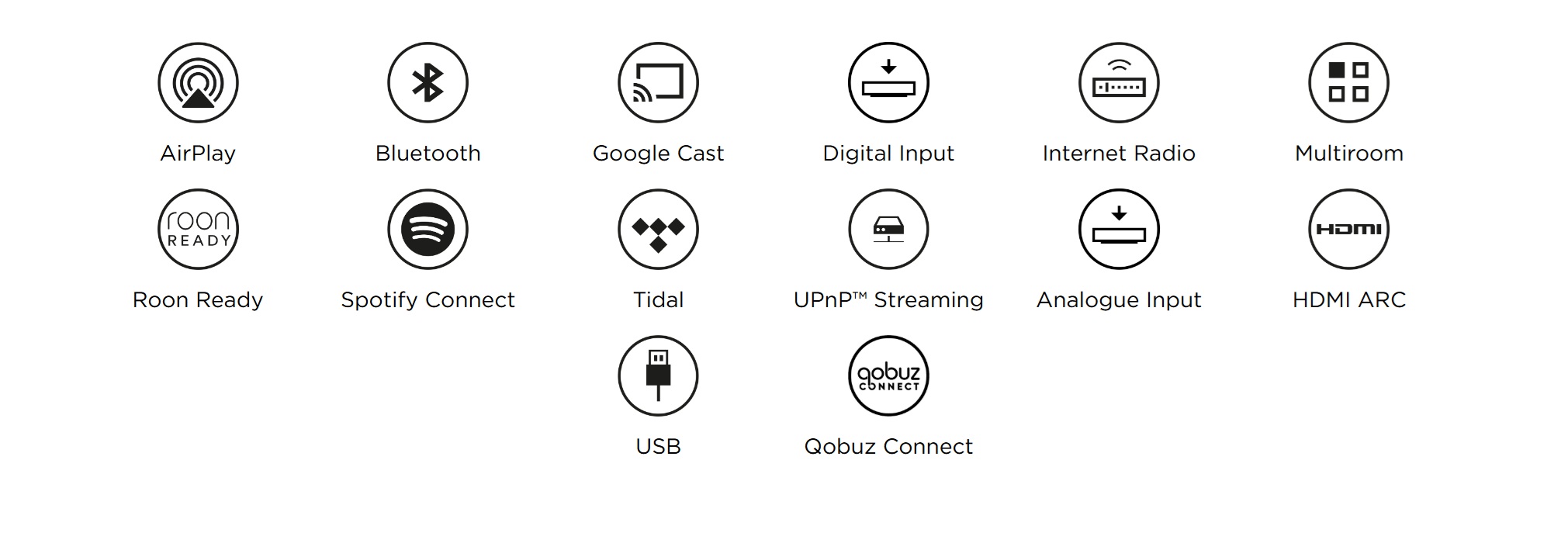 Streaming : Apple AirPlay 2, Bluetooth, Google Cast, Internet Radio, QOBUZ, Roon Ready, SPOTIFY® Connect, TIDAL, UPnP™;