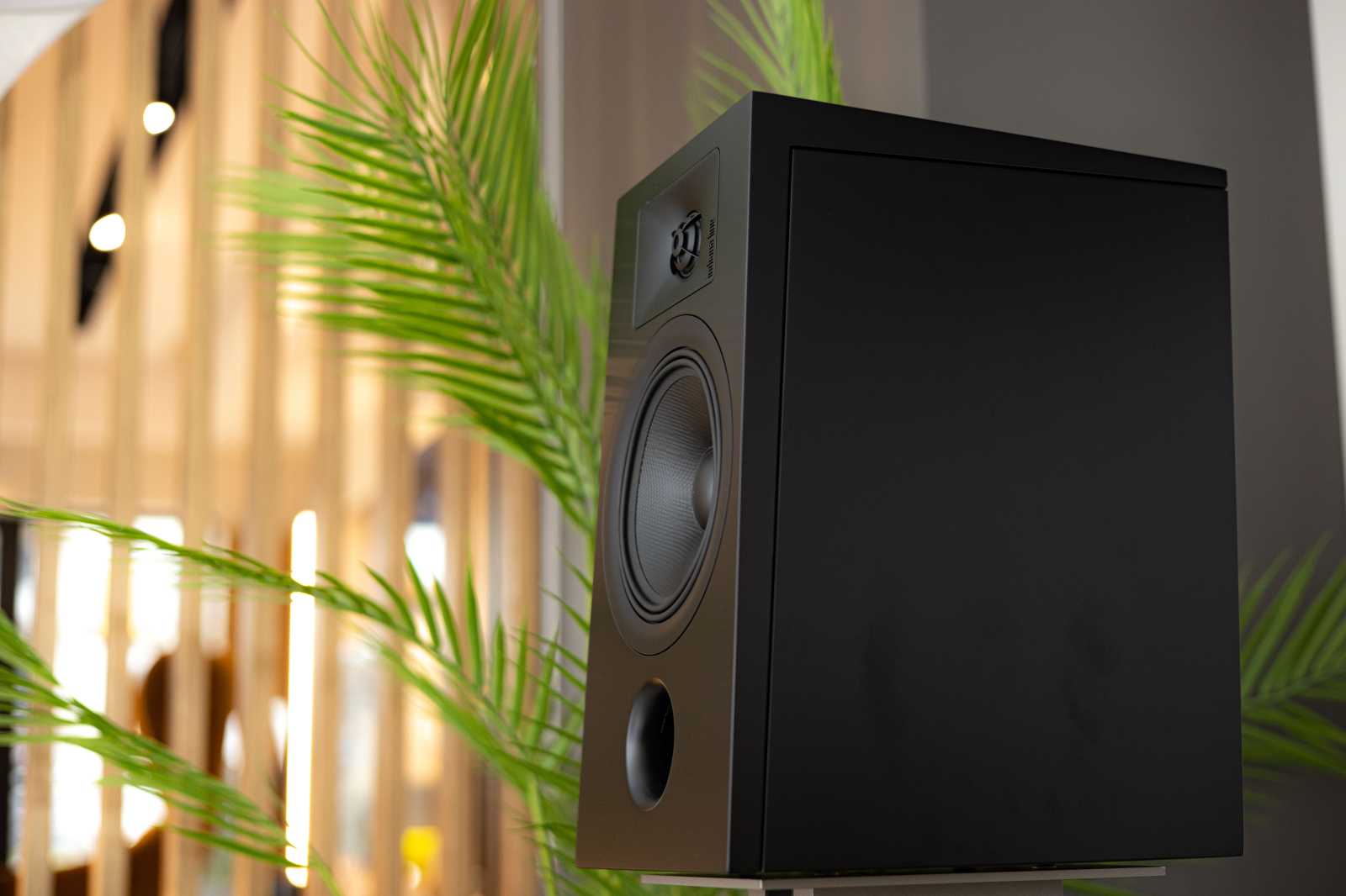 Difuzorul include o grila atasata magnetic, realizata dintr-un material textil neutru din punct de vedere acustic, care nu compromite echilibrul tonal. Odata montata, carcasa devine un bloc minimalist, monolitic. Geometria trapezoidala a carcasei este apoi incadrata de grila neagra, care lasa o margine subtila de 10 mm in jurul marginii deflectorului. Acest lucru evidentiaza si mai mult profilul lateral dinamic al difuzorului si evoca simbolul atemporal al armoniei - lira clasica - reinterpretata in linii moderne si clare.
