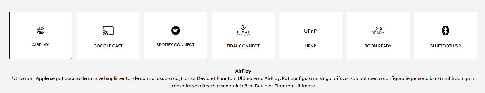 Wireless: Bluetooth, Wi-Fi (compatibil cu Apple AirPlay 2, Spotify Connect);