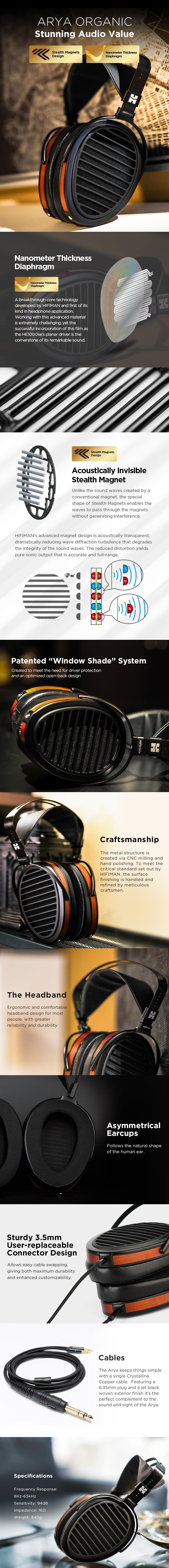 Suprema versiune a iubitei serii Hifiman Arya este aici. Căștile Hifiman Arya Organic Planar Magnetic Over-Ear Open-Back sunt cea mai rafinată versiune a seriei Hifiman Arya de până acum și punctul culminant al multor ani de cercetare și dezvoltare intreprinsi de Dr. Fang Bian (CEO al Hifiman) și talentata sa echipa de ingineri. La pretul sau, reprezinta un raport calitate-pret excelent in industria audio in acest moment. Arya Organic are noii magneți Stealth de la Hifiman, un șasiu nou proiectat, conectori de 3,5 mm pentru a permite schimbarea ușoară a cablului, confort excelent și design ergonomic.