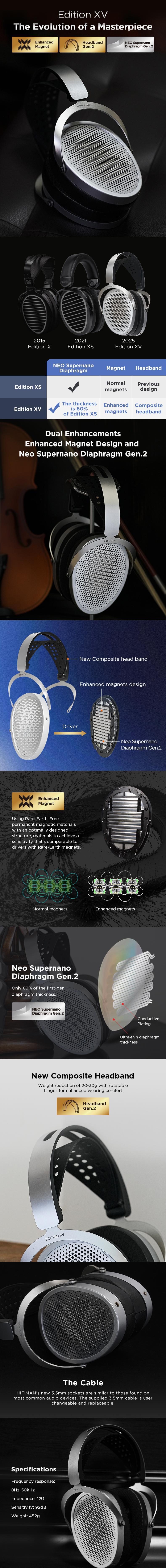 Hifiman lanseaza Edition XV. Modelul Edition XV utilizeaza materiale magnetice nou dezvoltate, care ofera sensibilitatea specifica designurilor cu metale rare, fara a folosi efectiv metale rare si a suporta costul suplimentar. Combinat cu diafragma Neo Supernano de generatia a doua, acum cu 60% mai subtire decat inainte, acest model atinge o reactie extrem de rapida si o claritate remarcabila pe intregul spectru de frecvente.