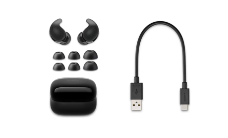 Deschideti ambalajul Linkbuds Fit si veti gasi 4 dimensiuni de varfuri pentru casti pentru a se potrivi cu diferite forme de urechi si o carcasa de incarcare USB-C.