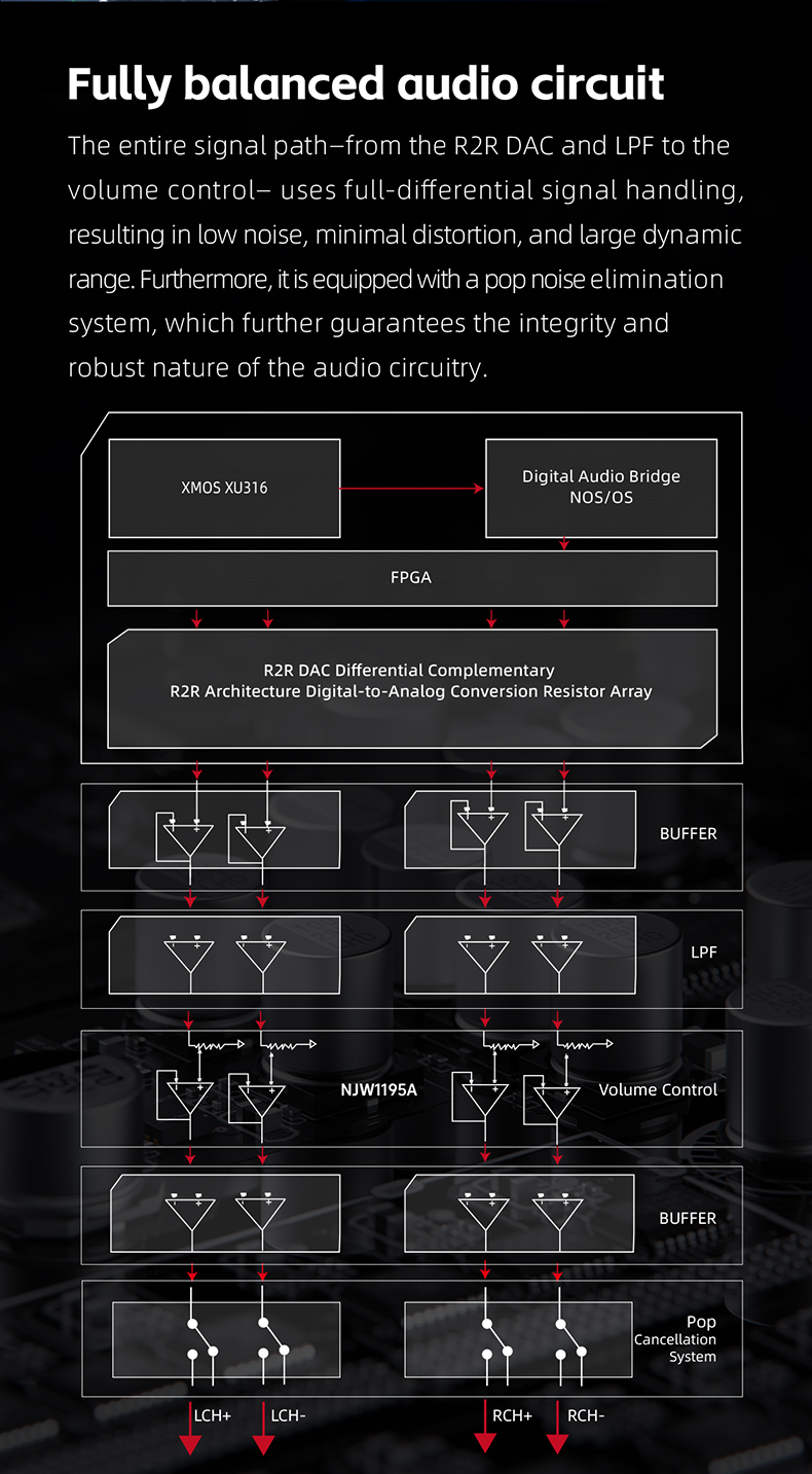 Sunet de top: folosește un DAC propriu, pe bază de rezistori (“true 24-bit R2R fully differential”), cu 192 rezistenţe de mare precizie, ceea ce oferă un fundal foarte silențios, dinamica naturală și un timbru cald, detaliat.