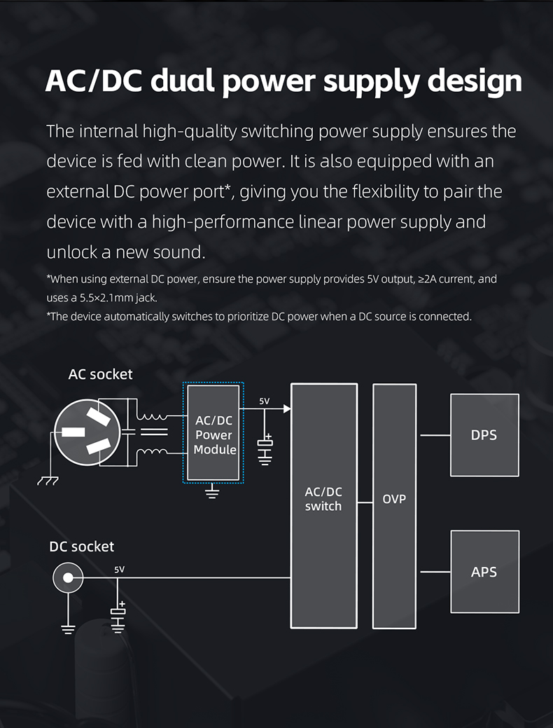 Moduri de redare: poți alege între NOS (non-oversampling) — pentru un sunet mai “organíc/analogic” — și OS (oversampling) — pentru o redare mai clară și detaliată.