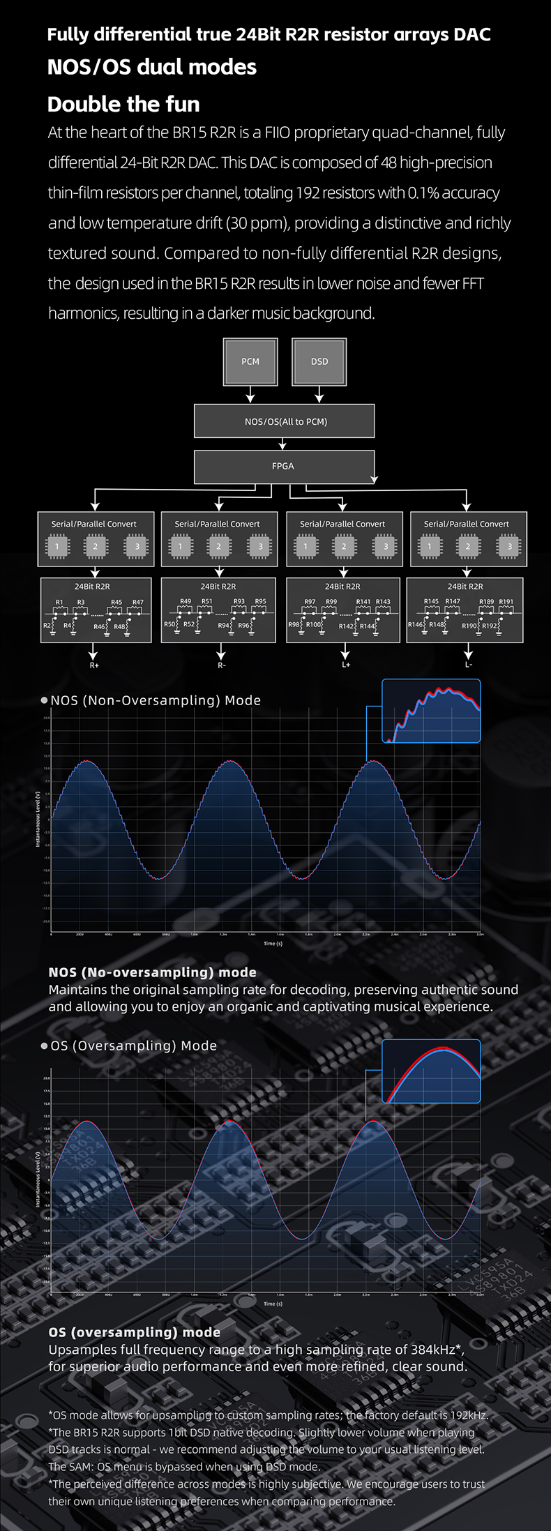FiiO WARMER R2R este un DAC portabil de înaltă fidelitate ce adoptă o arhitectură R2R discretă (ladder DAC) cu rezistențe de precizie, calibrate meticulos pentru a asigura o conversie digital-analog extrem de liniară și coerentă tonal. Fiecare canal utilizează o rețea separată de rezistențe, minimizând crosstalk-ul și păstrând integritatea semnalului audio.