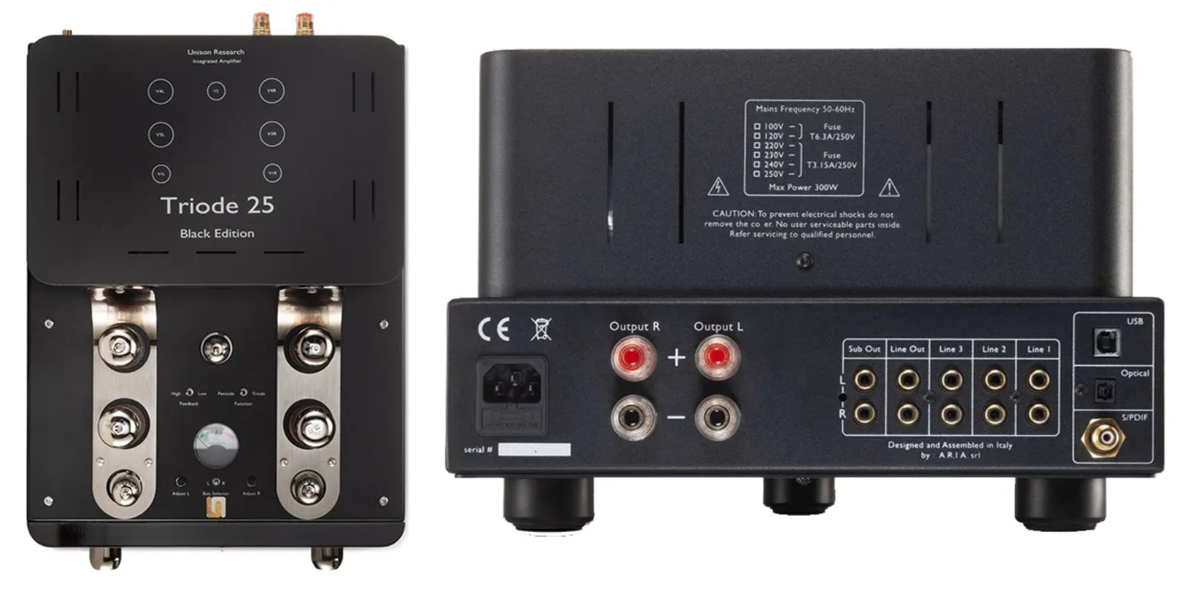 Toate componentele tuburilor utilizate sunt Gold Lion, o garanție a calității și performanței: două ECC83 și un ECC82 pentru preamplificator și patru KT77 într-o configurație push-pull pentru amplificatorul de putere. Utilizarea unor tuburi de calitate superioară, atent potrivite, permite modelului Unison Triode 25 Black Edition să ofere un sunet transparent, bogat armonic și captivant din punct de vedere muzical.