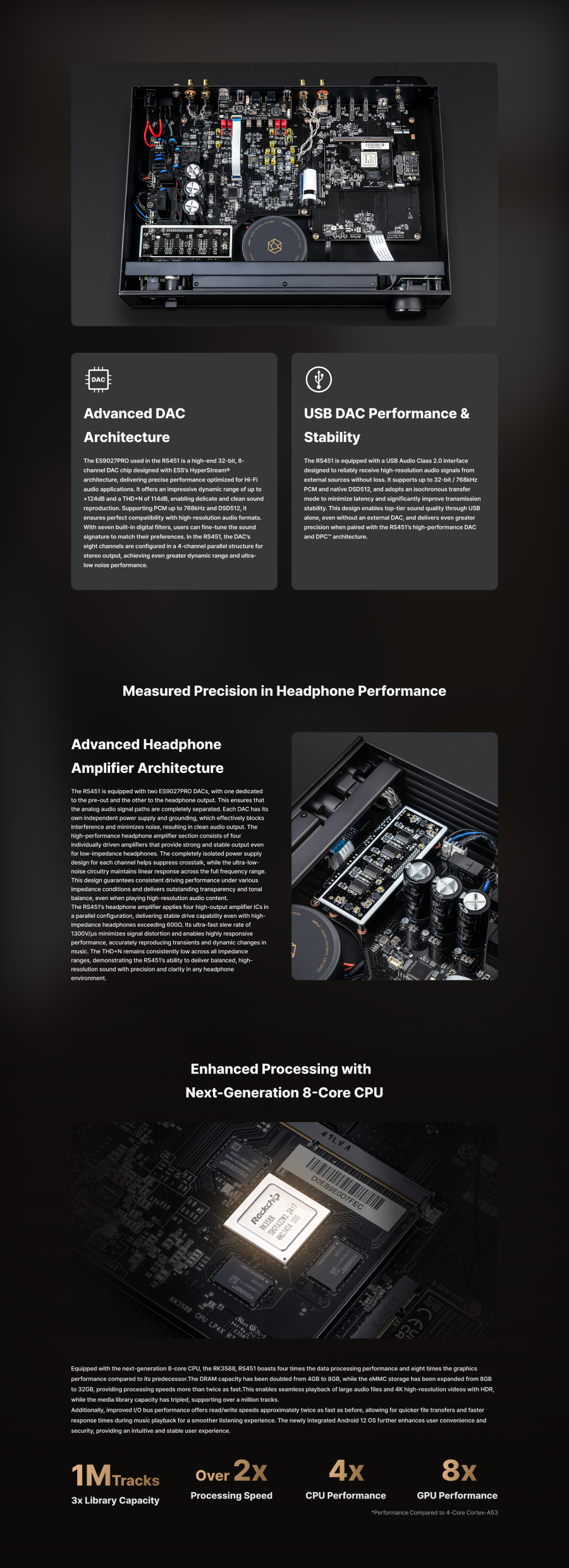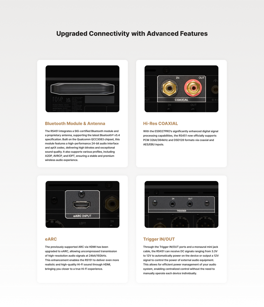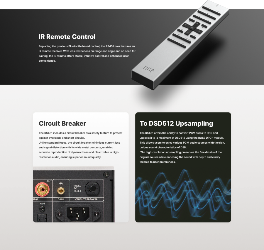 • Nucleul de procesare digitală ROSE DPC™ și arhitectura analogică de reducere a zgomotului ROSE NRA™ oferă un sunet plat și transparent, cu o distorsiune extrem de redusă (0,00025% THD+N).