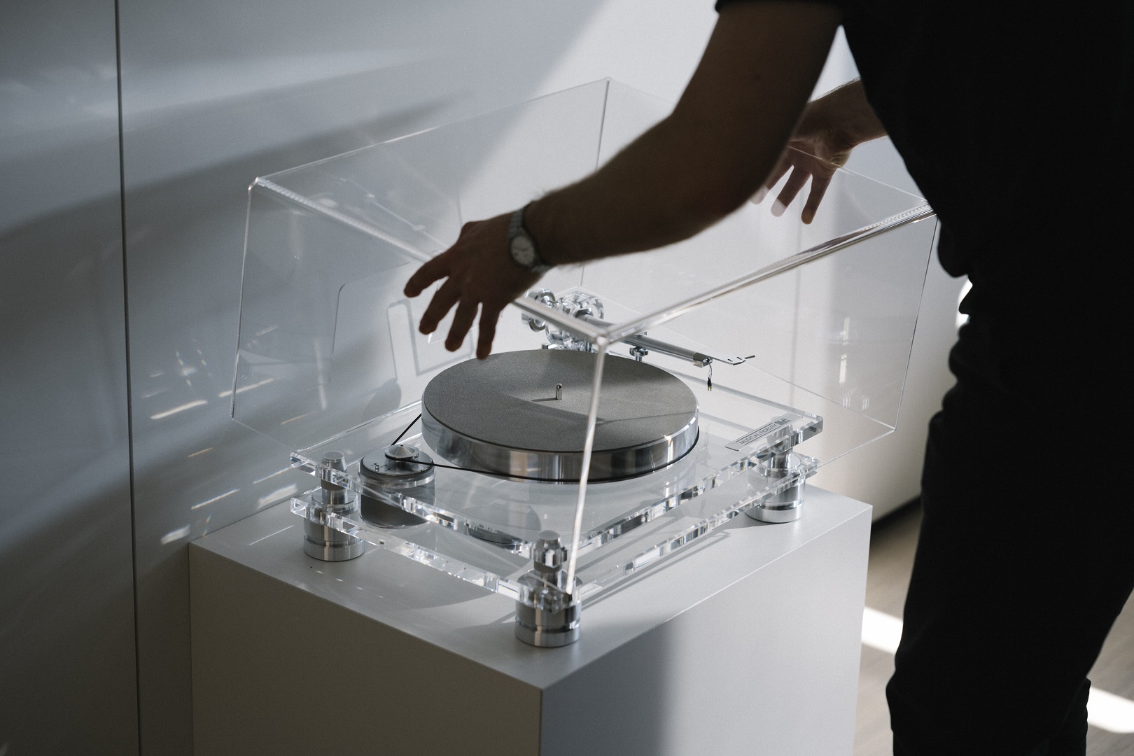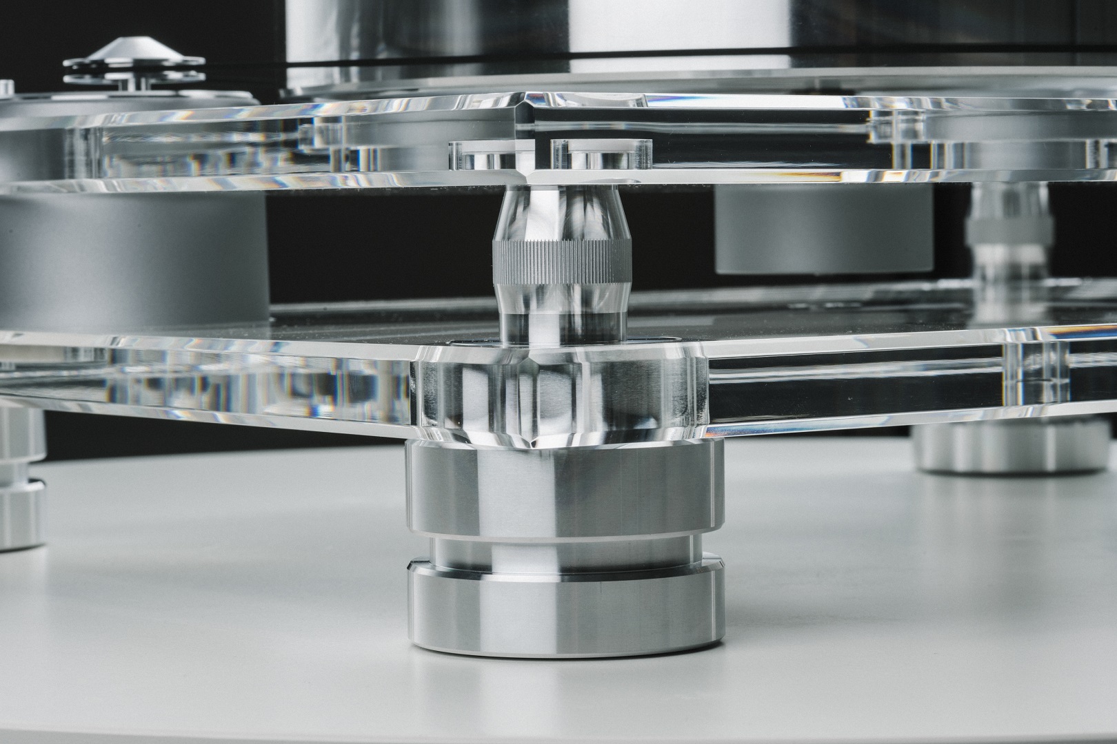 Patru picioare grele din aluminiu amortizat cu TPE, cu suport magnetic, conectează cele două socluri acrilice cu distanțiere din teflon între ele. Le puteți regla în înălțime rotind partea centrală zimțată a picioarelor pentru a nivela platanul.