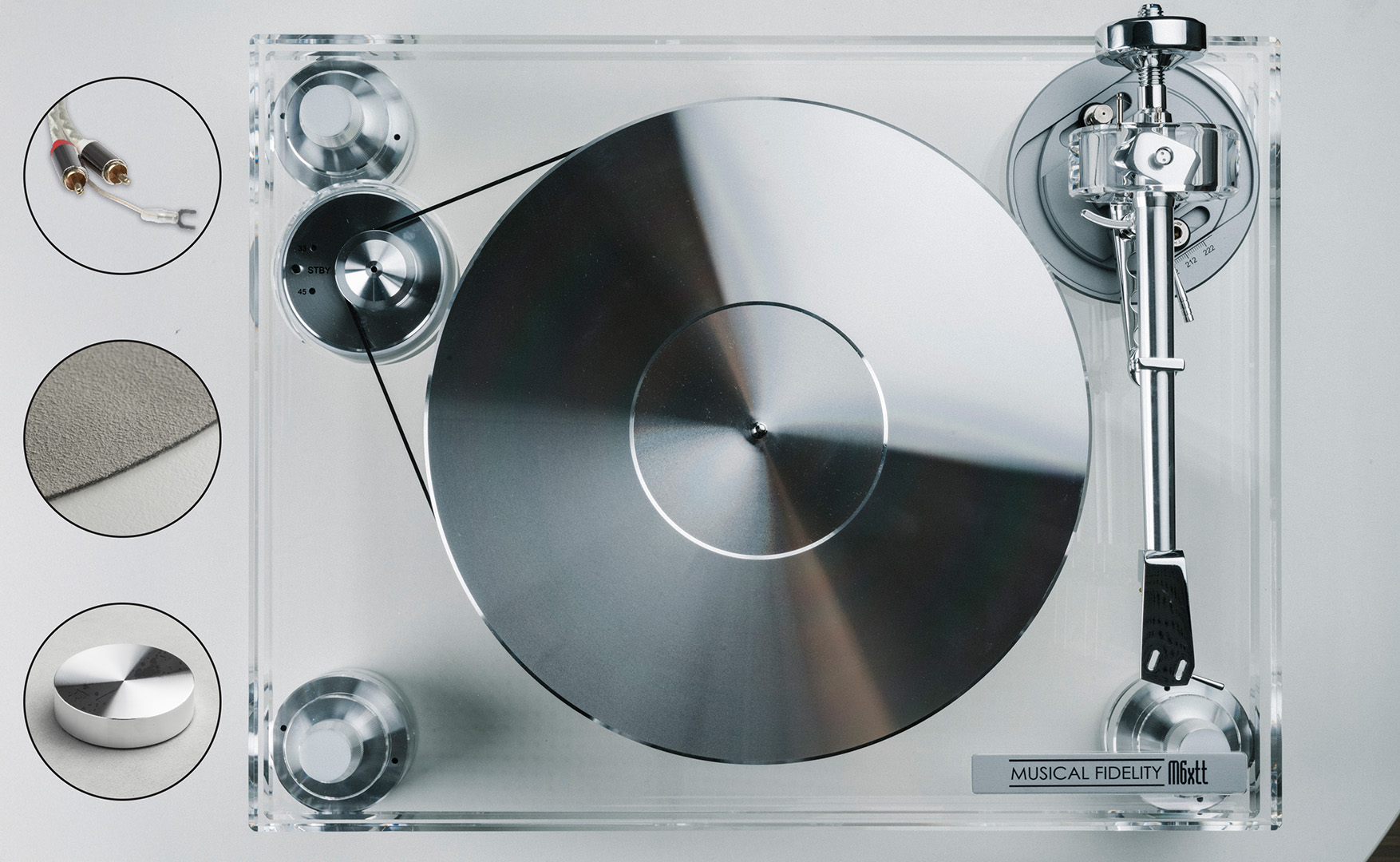 M6xTT stabilește filozofiile de design ale legendarului pick-up M1 din linia noastră M6. Designul M1 a fost creat de fondatorul Musical Fidelity, Antony Michaelson, și de Heinz Lichtenegger - pe atunci distribuitor Musical Fidelity și acum proprietar al mărcii. Designul a fost foarte important și ar fi trebuit să se potrivească cu amplificatoarele uimitoare din punct de vedere mecanic. Ideea de bază a fost de a combina masa inertă a aliajelor metalice cu acrilicul fără rezonanță. Motorul a fost decuplat efectiv de braț și platan prin construcția cu șasiu dublu.