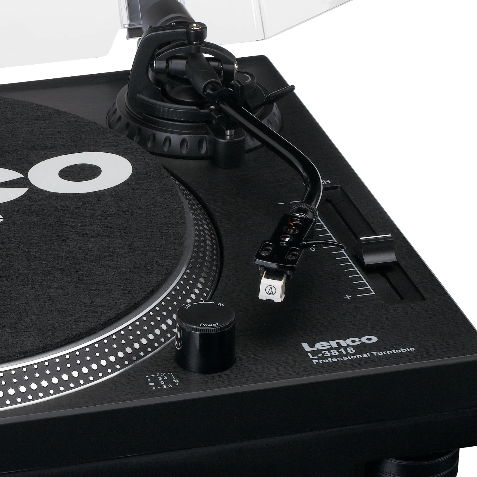 Lenco L-3818BK este un pick-up profesional cu acționare directă de înaltă calitate, potrivită în special pentru DJ. Acționarea directă garantează că înregistrarea începe imediat. L-3818 este echipată cu iluminare pentru confort optim de operare și un stroboscop. Reglați cu ușurință viteza platanului cu un fader cu pitch variabil. Cu un preamplificator phono încorporat, puteți conecta Lenco L-3818BK direct la mixer sau stereo.