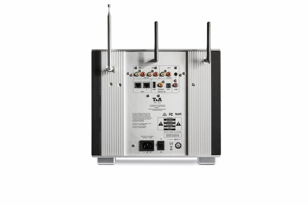Gama de conexiuni de pe panoul din spate indică domeniul de aplicare universal al echipamentelor Caruso. Setul poate fi utilizat pur și simplu ca un sistem compact care oferă o calitate impresionantă a sunetului, dar poate fi la fel de bine îmbunătățit pentru a forma nucleul unui sistem Hi-Fi de înaltă calitate prin simpla conectare a unui subwoofer sau a unor difuzoare active suplimentare. Există, de asemenea, două intrări analogice, de obicei pentru conectarea unei plăci turnante cu preamplificator phono și a unei surse analogice suplimentare, plus două intrări digitale pentru conectarea televizoarelor sau a decodoarelor. Sunt prezente intrări de antenă pentru Bluetooth, WLAN și radio FM/DAB+. Deoarece tunerele DAB+ și VHF sunt capabile să ofere un sunet superb, merită cu siguranță să conectați o antenă externă de înaltă calitate. Accesul la cele mai recente medii muzicale este asigurat de priza LAN, de antena WLAN și de intrarea USB; Caruso detectează automat sursele de streaming conectate la el și exploatează facilitățile rețelei și ale internetului în stil optim.