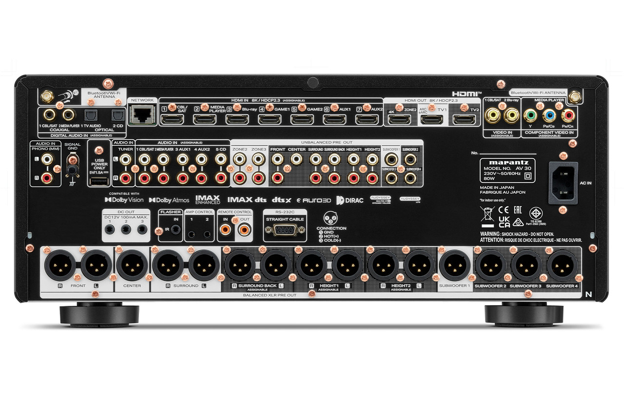 AV 30 oferă performanțe și capacități excepționale pentru săli media mari și sisteme home theater dedicate. Acest preamplificator AV echilibrat cu 11,4 canale este dotat cu circuite discrete Marantz HDAM și dispune de șapte intrări HDMI, fiecare dintre acestea fiind compatibilă cu 8K Ultra HD. Alimentat de HEOS™ pentru streaming de muzică de înaltă rezoluție, AV 30 include corecție de cameră cu Audyssey MultEQ XT32 și Dirac Live opțional. Oferă Dolby Atmos, DTS:X Pro, AURO-3D și dispune de intrări multiple și ieșiri preamplificate echilibrate pentru toate canalele, inclusiv patru subwoofere independente.